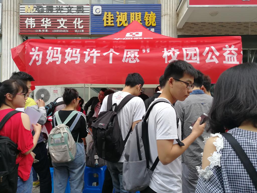 在佳山校区三食堂门口举办“为妈妈许个愿”校园公益活动。路过的同学积极参与到活动中,在纸条上为自己的母亲写下一段段真挚感人的祝福,然后投放在漂流瓶中。短短一天的时间,载着祝福的纸条就装满了3个瓶子。“萱草生堂阶,游子行天涯;慈母依堂前,不见萱草花。感谢我的母亲!感谢天下所有的母亲!”“母爱是一首深情的歌,婉转悠扬,轻吟浅唱。在美好的节日,祝愿我的妈妈身体健康、万事如意!” 有同学这样写道。