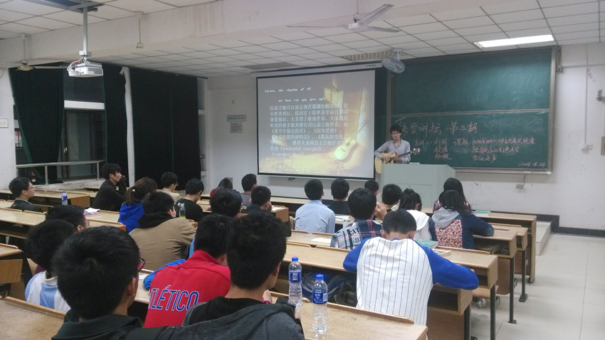 最后出场的是多才多艺的电2班杨枫,他的“吉他之声”为大家展示了吉他的发展史、吉他的类型、吉他的构造以及吉他的演奏技巧,引领同学们一起进入神秘的吉他世界,并在最后更是自弹自唱了一曲动听的《wonderful tonight》讲本能贤讲坛推到了高潮。