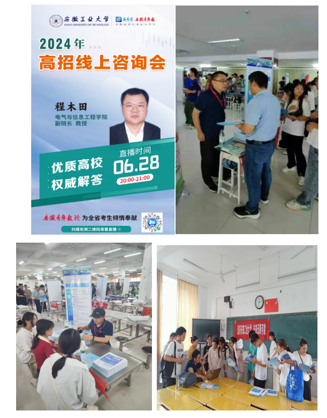 党委副书记李克明带队至青阳中学;安徽省教学名师、副院长程木田教授在安青网平台进行线上宣讲;电气工程系郑诗程教授随学校组团至阜南一中、阜阳的红旗中学、五中、界首一中、太和中学、太和一中、临泉临化中学;电工电子的连马俊博士随学校组团至亳州的一中、二中、十八中、涡阳的一中、二中、育萃中学、蒙城的一中、二中、一中南校、利辛的一中、启明东方高中、启明实验中学等多所中学开展高校招生现场咨询会,面对面为考生和家长提供便捷高效的“一站式”招生咨询服务。