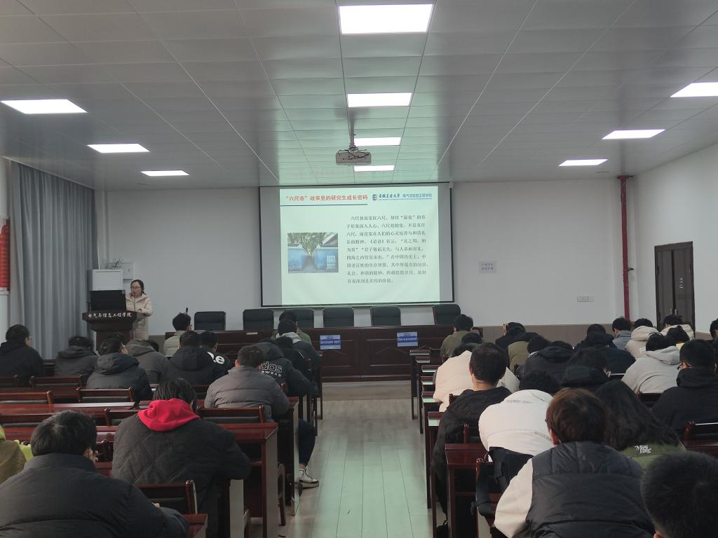 辅导员为同学们讲解了“六尺巷”故事的由来及其深邃的文化内涵,共同探寻历史典故中蕴藏着的中国智慧。她分享道,六尺巷虽宽仅六尺,却以“最宽”的巷子形象深入人心。六尺巷的宽,不是宽在六尺,而是宽在和谐礼让的精神。她强调了礼让精神对个人、社会、国家的重要意义,同时结合日常的宿舍管理、科研工作、评奖评优、资助工作等紧贴研究生生活和学习的实际情况,从“六尺巷”典故引发学生对宿舍矛盾、竞争与合作、同窗情谊等日常人际关系问题的思考,带领大家一起探究“六尺巷”故事里的研究生成长密码。她激励研究生们能自觉从中华民族传统美德中汲取道德滋养,从自身内省中提升道德修为,践行“让他三尺又何妨”的谦逊、礼让和包容。