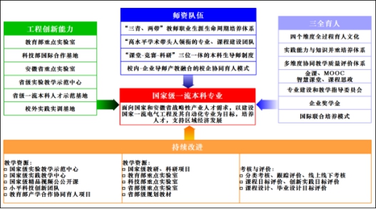 电气工程及其自动化专业为安徽省级特色专业,专业以多个省部级研究中心、专业实验室为依托,针对高耗能、高排放、电力冲击负荷频繁的重型工业行业特点,坚持以各行各业的工业制造企业的供配电、电气自动化控制、节能减排企业的绿色、低碳和可持续发展为培养方向的专业特色。