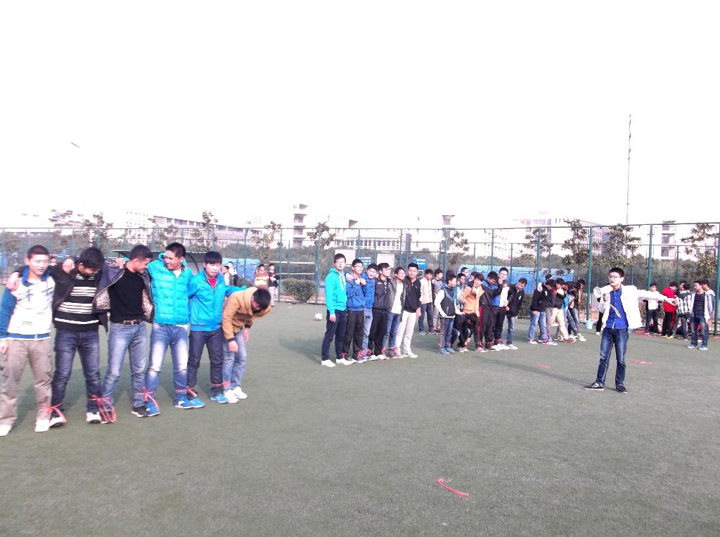 此次活动历时2个半小时,开始时先进行了几个小游戏进行热身,比如“缩小包围圈”,“贴烧饼”,“五毛和一块”。之后进行了重点游戏“多人多足”。6名同学组成一组,总共16组,将自己的脚和旁边同学的另外一只脚配成对,比赛分为初赛16进8,复活赛8进1,半决赛9进3以及最终决赛。活动过程中,每个同学都积极参与进来,同学们之间也配合十分默契,虽然天气寒冷,但同学们的热情不减,运动场上不时传出一阵阵欢声笑语。