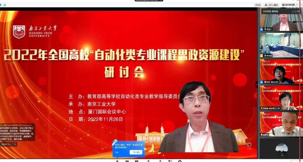 高度重视,专门组织了自动化及相关专业教师参加线上会议。本次会议由教育部自动化类教指委组织,旨在探讨自动化类专业课程思政示范课程的数字化资源建设内容和标准规范,推动自动化专业人才培养更好地满足社会经济发展的需要。