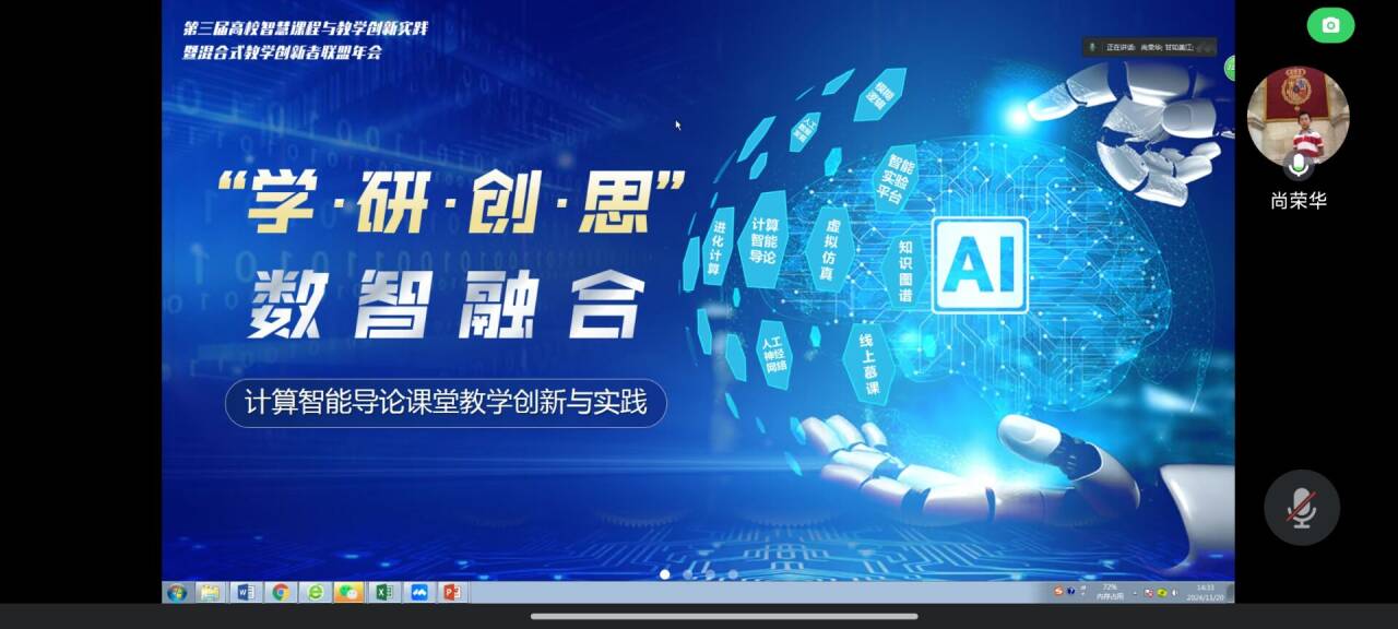 11月20日,西安电子科大特聘教授、课程思政首席专家尚荣教授主讲《“学—研—创—思”数智融合——计算智能导论智慧课程混合式教学创新实践》报告,讲座聚焦《计算智能导论》课程教学中的前沿内容探索不足、个性共性兼顾不足、创新实践训练不足等痛点问题,提出“学—研—创—思”的课程教学改革理念,通过打造智慧课程建设的“六大要素”,以科研反哺教学、运用人工智能打造创新实验平台;运用音频去噪技术的实践案例——将优秀歌曲《我爱你,中国》融入专业教学过程中,达到潜移默化的思政育人效果;借鉴星火大模型和知识图谱赋能智慧课程建设,为课程思政育人创新实践提供了新的教学案例和新的解决思路,让老师们耳目一新,深受启发。11月21日,教育部工程教育专业认证专家、沈阳航空航天大学自动化成人动漫