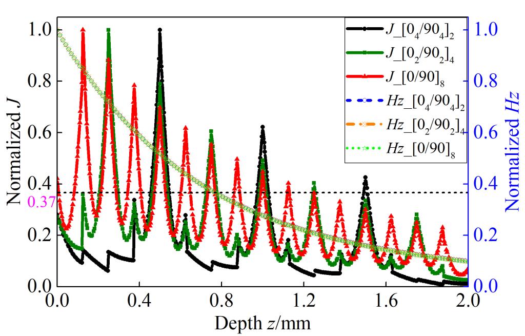 为满足CFRP损伤涡流检测的应用需求,本研究探索了电磁场在多层CFRP板结构中的传播、衰减与扩散特性,解决了多层导电介质交界面处的场量突变问题。研究结果表明,材料的电各向异性是电磁场快速衰减的关键因素,由波印廷定理知强电各向异性造成更多的能量损耗,使得电磁场的衰减特性与频率无关。铺层变化是影响电磁场衰减与扩散的又一重要因素,电磁场的衰减与扩散和相邻铺层角度差呈反比。从入射场角度看,激励源形状是影响电磁场传播特性的另一重要因素,电磁场的衰减与扩散和激励源形状呈反比。该研究结果为定量检测与评估CFRP结构深处缺陷奠定了理论基础,同时为涡流检测探头的设计/优化提供了理论依据。