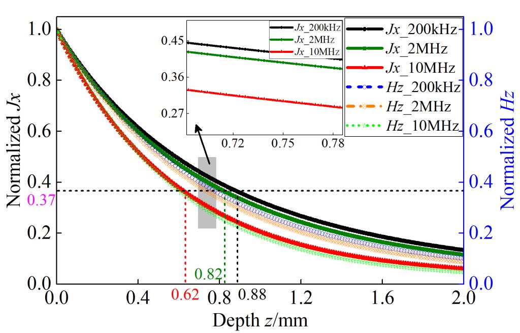 (电磁场分量在碳材料(左)、CFRP单向板(中)和CFRP正交板(右)厚度方向的衰减)