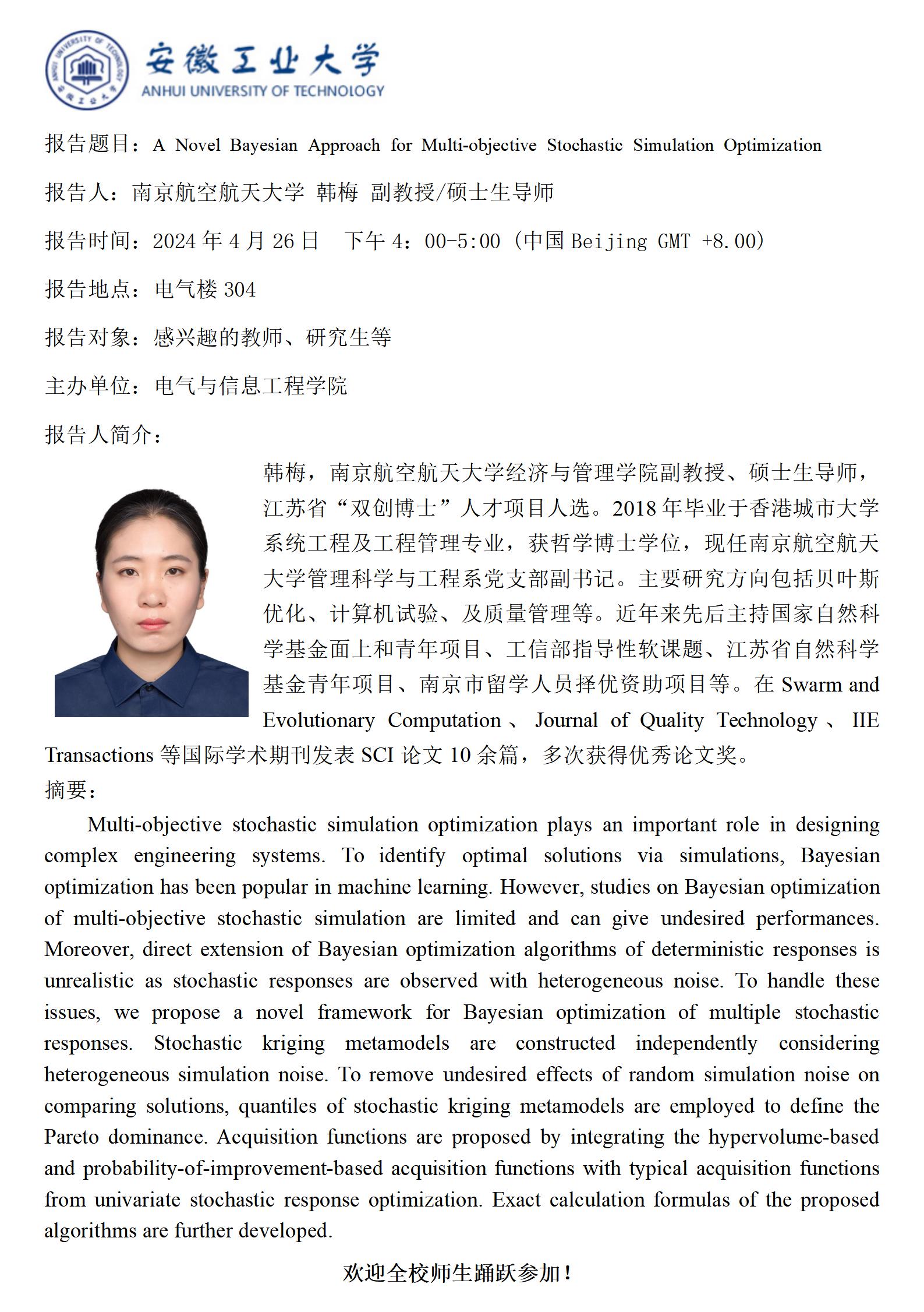 砺山学术报告之三十三-A Novel Bayesian Approach for Multi-objective Stochastic Simulation Optimization