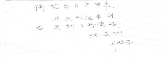 领导精心题写了考研寄语:“考研是一场十分美妙而紧张并极富挑战色彩,需要持续奋进的人生考验”、“梅花香自苦寒来”激励考生坚持到底,实现梦想。临考前,年级辅导员通过QQ、微信等网络平台为同学悉心提醒。考试当天辅导员在考场门口为考研学子鼓劲加油。