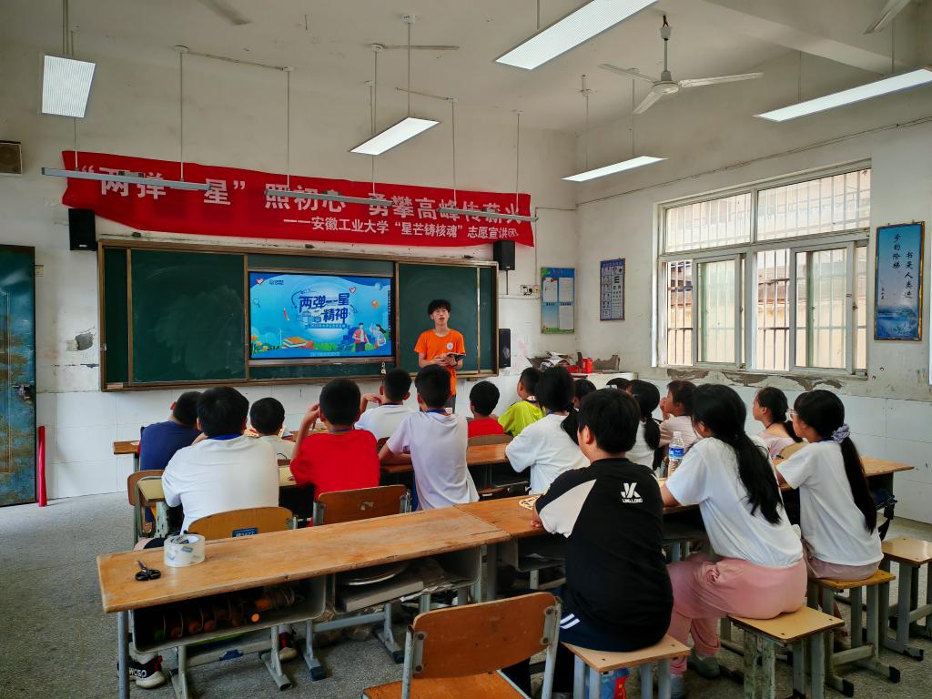 “烛光萤火·电亮童心”实践队作为国家级“星芒铸核魂”“两弹一星”精神志愿宣讲团,专程为卜陈学校18名留守儿童开展主题宣讲活动。王俊向实践队员们表达了亲切慰问,对宣讲团结合留守儿童认知特点、创新宣讲形式给予了肯定。他勉励实践队员们:一要珍惜实践机会,在叶连平老师身边学习其精神品格,深刻体悟“两弹一星”精神的时代价值;二要用情用心宣讲,紧密对接国家科教兴国、人才强国战略,生动讲好科学家故事,将爱国情怀和红色基因的种子深植于乡村少年儿童心中;三要锤炼过硬本领,在服务乡村、奉献社会的实践中增长才干,为乡村教育振兴贡献青春智慧和力量。