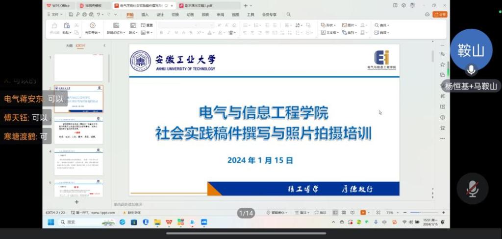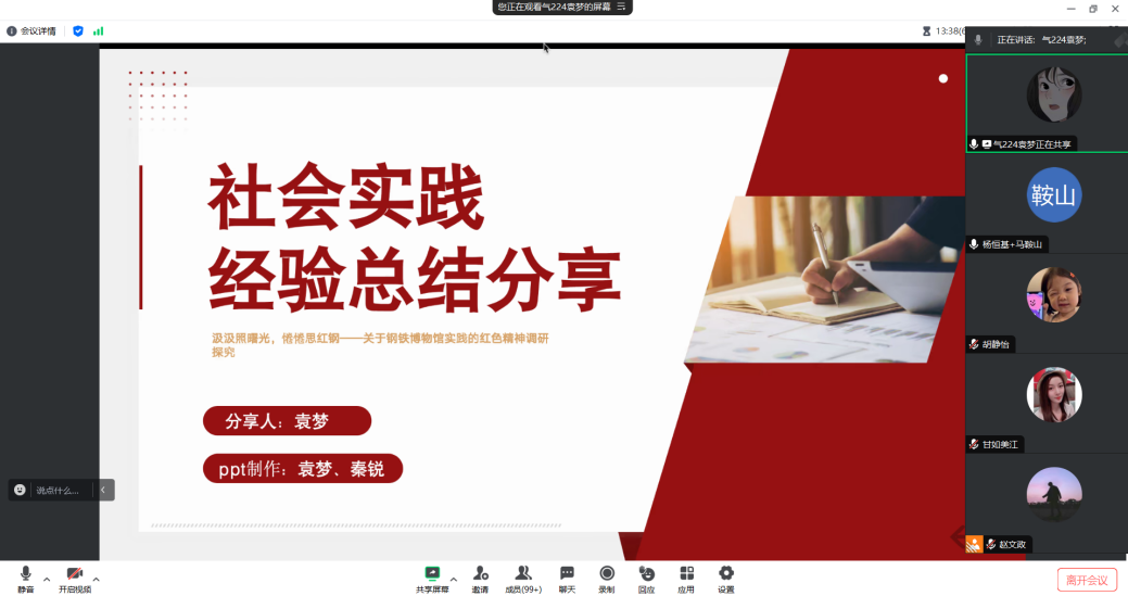 暑期社会实践优秀学生代表袁梦做交流分享,从社会实践选题背景、调研过程和调研方法、报告撰写与视频制作等多个方面进行介绍,并结合自身经验为寒假社会实践队员答疑解惑。