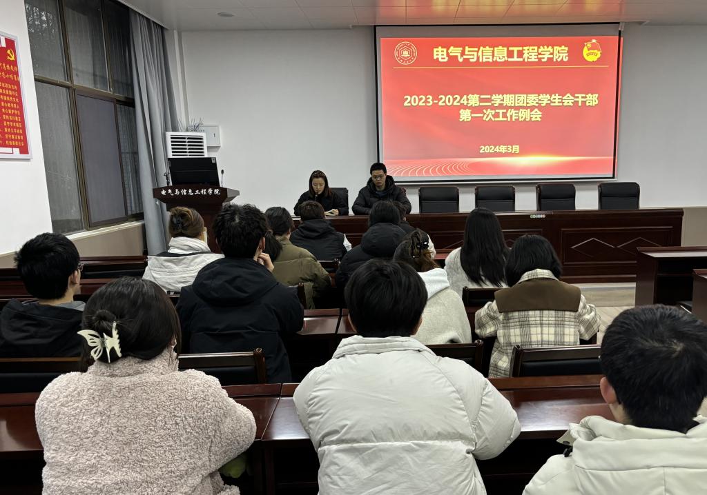 在秀山校区电气楼113教室开展新学期团委学生会干部第一次工作例会,院团委书记甘如美江、院团委副书记杨恒基、主席团成员及团委学生会各部门负责人参加。