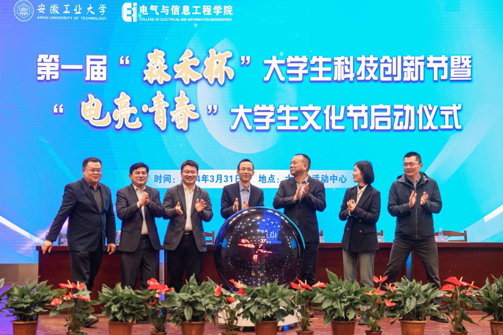 第一届“森禾杯”大学生科技创新节暨“电亮·青春”大学生文化节正式开幕,与会领导走向前台共同按下了启动仪式球。