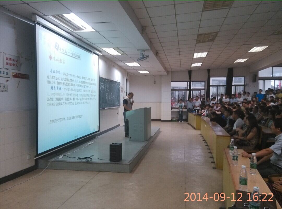 在秀山校区阶梯教室101召开2014级新生家长会,全体辅导员以及近500多位新生家长或新生参加,院党委书记黄国才,副书记、副院长郭宏出席会议。